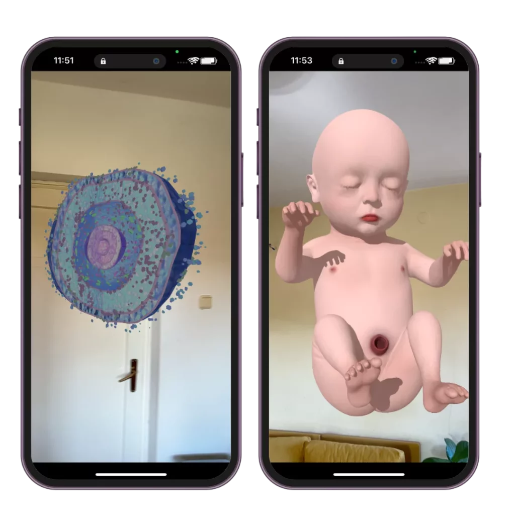 An interactive AR installation visualizes a child’s development from conception to birth, allowing you to follow your baby’s growth from a single cell to a fully formed infant.